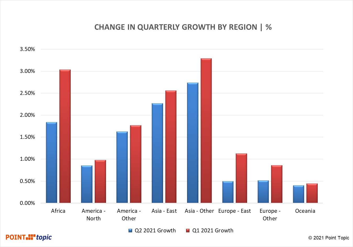 Figure 5. Quarterly growth in fixed broadband subscribers by region, Q2 2021 vs Q1 2021. Source: Point Topic.