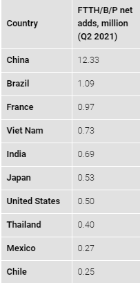 在 FTTH 凈新增用戶方面,中國以 1230 萬用戶領(lǐng)先,巴西新增超過 100 萬,法國光纖寬帶用戶新增近 100 萬。