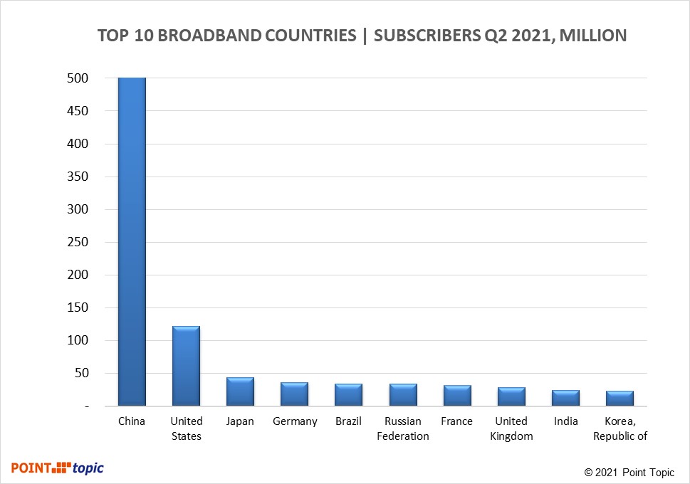 Figure 13. Country ranking by fixed broadband subscribers in Q2 2021. Source – Point Topic.
