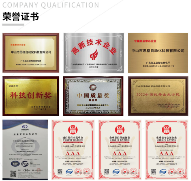 自成立以來,思格自動化堅持積累科研成果,在不同行業(yè)領(lǐng)域取得突出成績并獲得高科技企業(yè)、創(chuàng)新性中小企業(yè)、專精特新、3A認(rèn)證、及多項發(fā)明/,實用新型專利等諸多榮譽。