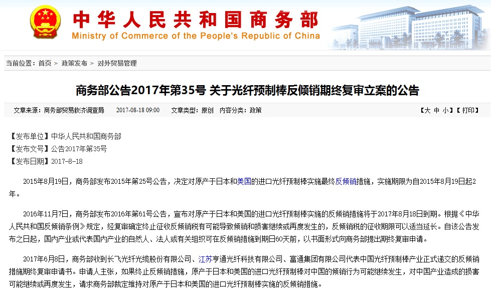 2017年6月8日,商務(wù)部收到長(zhǎng)飛光纖光纜股份有限公司、江蘇亨通光纖科技有限公司、富通集團(tuán)有限公司代表中國(guó)光纖預(yù)制棒產(chǎn)業(yè)正式遞交的反傾銷措施期終復(fù)審申請(qǐng)書(shū)。申請(qǐng)人主張,如果終止反傾銷措施,原產(chǎn)于日本和美國(guó)的進(jìn)口光纖預(yù)制棒對(duì)中國(guó)的傾銷行為可能繼續(xù)發(fā)生,對(duì)中國(guó)產(chǎn)業(yè)造成的損害可能繼續(xù)或再度發(fā)生,請(qǐng)求商務(wù)部裁定維持對(duì)原產(chǎn)于日本和美國(guó)的進(jìn)口光纖預(yù)制棒實(shí)施的反傾銷措施。