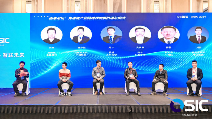 專題論壇最后,OSIC 大會(huì)還舉辦了圓桌論壇“光通信產(chǎn)業(yè)鏈跨界發(fā)展機(jī)遇與挑戰(zhàn)”,由米硅科技總經(jīng)理羅剛擔(dān)任主持,中國(guó)聯(lián)通魏步征、申萬(wàn)宏源劉洋、蘇州大學(xué)劉寧、長(zhǎng)光華芯吳真林、中科院半導(dǎo)體所陳偉出任互動(dòng)嘉賓。大家圍繞光通信產(chǎn)業(yè)鏈在跨界融合中遭遇的技術(shù)問(wèn)題和市場(chǎng)挑戰(zhàn),如何抓住人工智能+光電的融合機(jī)遇,如何構(gòu)建核心競(jìng)爭(zhēng)力以及如何發(fā)揮政策優(yōu)勢(shì)進(jìn)行了深度探討和交流分享。