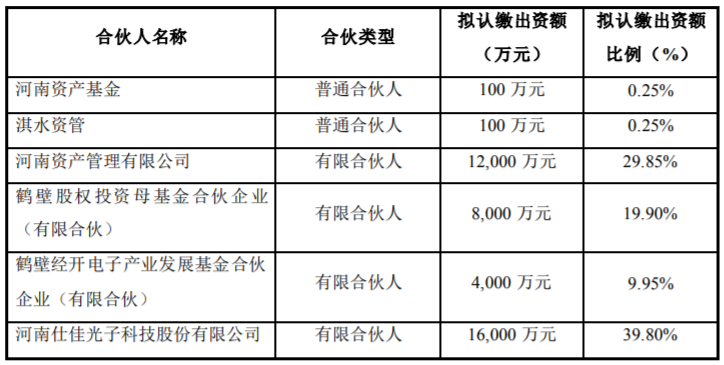 同時,為降低投資風險,提高資金盈利能力,公司通過引入社會資本助力產(chǎn)業(yè)發(fā)展,擬與河南資產(chǎn)基金管理有限公司(以下簡稱“河南資產(chǎn)基金”)、河南淇水資產(chǎn)管理有限公司(以下簡稱“淇水資管”)、河南資產(chǎn)管理有限公司、鶴壁股權投資母基金合伙企業(yè)(有限合伙)、鶴壁經(jīng)開電子產(chǎn)業(yè)發(fā)展基金合伙企業(yè)(有限合伙)共同投資設立河南泓淇光電子產(chǎn)業(yè)基金合伙企業(yè)(有限合伙)(暫定名,以工商登記機關最終核準登記的名稱為準)。