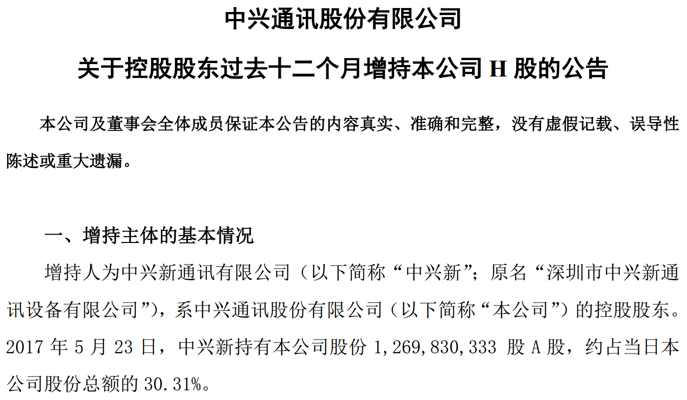 ICCSZ訊(編輯:Debi)5月23日晚間,中興通訊(證券代碼A/H:000063/763)發(fā)布關(guān)于控股股東過去十二個(gè)月增持本公司H股的公告。增持人為中興新通訊有限公司(以下簡稱“中興新”;原名“深圳市中興新通訊設(shè)備有限公司”),系中興通訊股份有限公司(以下簡稱“本公司”)的控股股東2017 年 5 月 23 日, 中興新持有本公司股份 1,269,830,333 股 A 股, 約占當(dāng)日本公司股份總額的 30.31%。