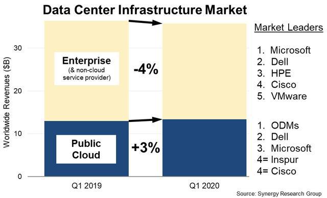ICC訊 Synergy公布2020年第一季度全球數(shù)據(jù)中心基礎(chǔ)設(shè)施收入數(shù)據(jù),數(shù)據(jù)中心基礎(chǔ)設(shè)施設(shè)備總收入,包括云和非云,硬件和軟件為358億美元,同比下降2%;公有云基礎(chǔ)設(shè)施占總收入的37%以上,云供應(yīng)商收入增長(zhǎng)3%,傳統(tǒng)的IT供應(yīng)商銷(xiāo)售下降4%。