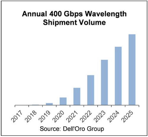 在Dell'Oro于2021年7月發(fā)布的光傳輸五年預(yù)測(cè)報(bào)告中,400Gbps波長(zhǎng)的出貨量預(yù)計(jì)將在2022年增長(zhǎng)70%,并在其廣泛采用的推動(dòng)下占當(dāng)年新增容量的大部分。此外,QSFP-DD封裝的400ZR(400Gbps ZR)由于其小尺寸、低功耗、互操作性和經(jīng)濟(jì)性,需求預(yù)計(jì)將在2022年大幅增長(zhǎng)。由于這些可將400Gbps波長(zhǎng)傳輸?shù)?20公里的低功率可插拔光學(xué)器件,人們對(duì)IP-over-DWDM(IPoDWDM)(一種將DWDM光學(xué)器件集成到以太網(wǎng)交換機(jī)或路由器中的系統(tǒng)架構(gòu))的興趣增長(zhǎng)。Dell'Oro預(yù)測(cè)400ZR的出貨量在2022年將增長(zhǎng)450%,盡管其銷量基數(shù)較低。