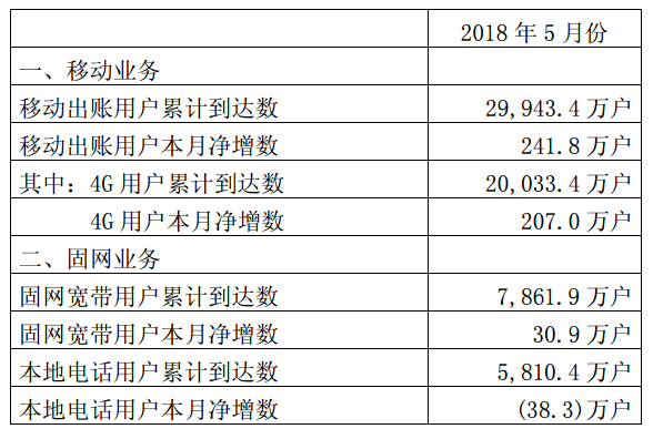 中國聯(lián)通2018年5月運營數(shù)據(jù)