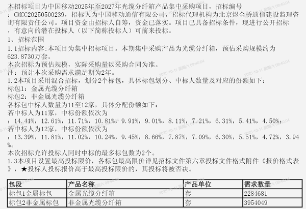 本次集中采購規(guī)模約為623.8730萬套光纜分纖箱產(chǎn)品,預(yù)計采購需求將滿足未來兩年的建設(shè)需要。實際采購數(shù)量將以最終簽訂的采購合同為準(zhǔn),本次公布的僅為預(yù)估規(guī)模。