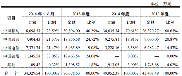 從銷售對象來看,科信技術(shù)90%以上的銷售收入來源于國內(nèi)三大通信運(yùn)營商及鐵塔公司,2016年1-6月銷售對象份額分別為中移動23.59%、中聯(lián)通21.57%、中電信21.47%和中鐵塔33.05%。在中移動2016年度光分路器集采項目中,科信技術(shù)與日海通訊、天邑康和和中興新地等主要競爭對手一起上榜,科信技術(shù)獲得3.91%份額。