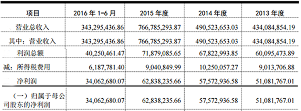科信技術(shù)2016年1-6月營收3.43億元,毛利率37.27%,凈利潤3406.2萬元;2015年營收7.67億元,毛利率39.72%,凈利潤6283.8萬元;2014年營收4.91億元,毛利率33.15%,凈利潤5757.3萬元;2013年營收4.34億元,毛利率36.22%,凈利潤5108.2萬元。