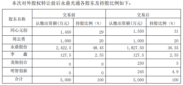 待本次交易完成后,永鼎光通的股權(quán)結(jié)構(gòu)為:周志勇持股20%,武漢同心元?jiǎng)?chuàng)科技技術(shù)合伙企業(yè)(有限合伙)持股31%,公司持股36.55%,蘇州龍駒創(chuàng)合創(chuàng)業(yè)投資合伙企業(yè)(有限合伙)持股 5%,北京明智倡新信息技術(shù)產(chǎn)業(yè)投資基金合伙企業(yè)(有限合伙)持股4.9%,李鑫持股2.55%。