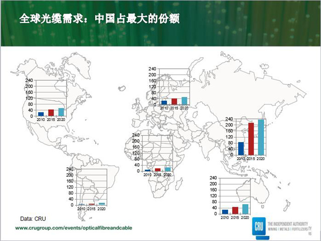 Iccsz訊 全球光纖光纜2016年總需求將達(dá)到4.25億芯公里,其中中國占57%,CRU中國區(qū)總裁約翰·約翰遜(John Johnson)預(yù)測稱。