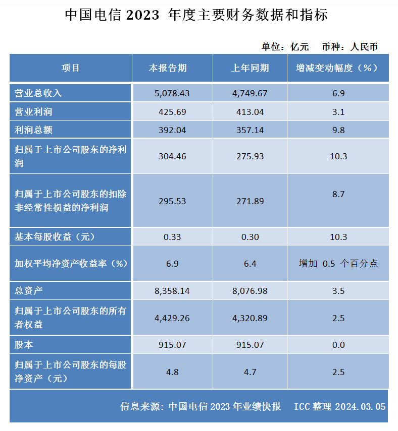 ICC訊 今日,中國(guó)電信公示了公司2023 年度業(yè)績(jī)快報(bào)。