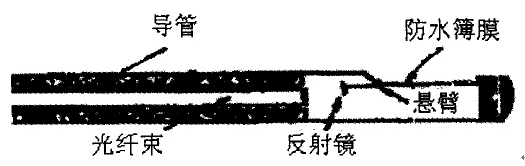 1 壓力測(cè)量。目前臨床上應(yīng)用的壓力傳感器主要用來(lái)測(cè)量血管內(nèi)的血壓、顱內(nèi)壓、心內(nèi)壓、膀胱和尿道壓力等。用來(lái)測(cè)量血壓的壓力傳感器示意見(jiàn)圖1。其中對(duì)壓力敏感的部分是在探針導(dǎo)管末端側(cè)壁上的一塊防水薄膜,一面帶有懸臂的微型反射鏡與薄膜相連,反射鏡對(duì)面是一束光纖,用來(lái)傳遞入射光到反射鏡,同時(shí)也將反射光傳送出來(lái)。當(dāng)薄膜上有壓力作用時(shí)。薄膜發(fā)生形變且能帶動(dòng)懸臂使反射鏡角度發(fā)生改變,從光纖傳來(lái)的光束照射到反光鏡上,再反射到光纖的端點(diǎn)。由于反射光的方向隨反射鏡角度的變化而改變,因此光纖接收到的反射光的強(qiáng)度也隨之變化。這一變化通過(guò)光纖傳到另一端的光電探測(cè)器變成電信號(hào),這樣通過(guò)電壓的變化便可知探針處的壓力大小。