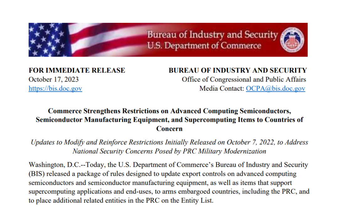 美國商務(wù)部部長吉娜·雷蒙多(GinaRaimondo)表示,新措施旨在“堵漏洞”,并表示這些措施未來可能至少每年更新一次。美高級政府官員還表示,如果數(shù)據(jù)中心芯片超過去年10月設(shè)定的性能閾值,或者超過以每平方毫米翻牌數(shù)衡量的新性能密度閾值基準(zhǔn),美國將簡單地限制數(shù)據(jù)中心芯片的出口。而想要向中國或其他禁運地區(qū)出口人工智能芯片的公司必須通知美國政府。高級政府官員還表示,他們計劃擴大受美國限制的半導(dǎo)體制造設(shè)備清單。