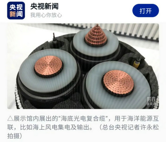 洋浦展示館內(nèi)展示了亨通面向海上風(fēng)電深遠(yuǎn)海發(fā)展研發(fā)的三項(xiàng)創(chuàng)新產(chǎn)品,總書記觀看了展示樣品并聽取了介紹。作為創(chuàng)新典范,亨通三項(xiàng)產(chǎn)品也受到央視新聞的關(guān)注和報(bào)道。