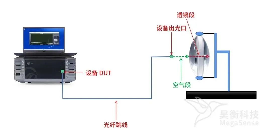 使用光纖微裂紋檢測儀測量凸透鏡中心厚度,如圖1所示,準(zhǔn)備一根匹配好測試長度的光纖跳線,一端接入設(shè)備DUT口,另外一端垂直對準(zhǔn)透鏡,讓接頭和透鏡之間預(yù)留一定距離,同時使用OLI進(jìn)行測量。