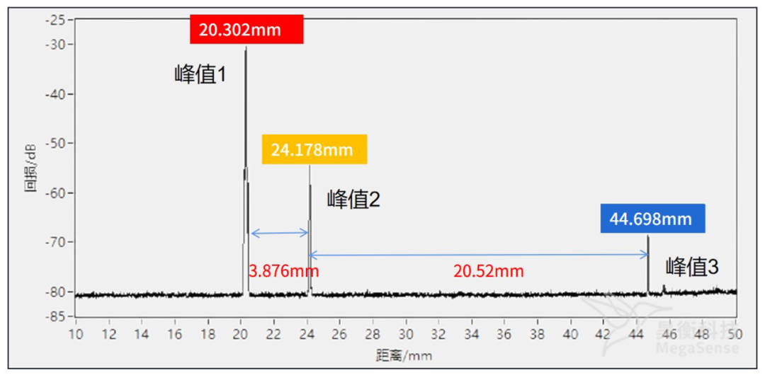 峰值1和2之間的距離為3.876mm,峰值2和3之間的距離為20.52mm,圖2中測得各峰值間距是在設(shè)備默認(rèn)折射率n1=1.467下測得,而空氣的折射率n2=1玻璃透鏡的折射率n3=1.6,所以空氣段的實際長度為:L 空=3.876*n1/n2=5.686mm,透鏡的實際厚度為 L鏡=20.52*n1/n3=18.814mm。使用游標(biāo)卡尺測量凸透鏡的厚度為19.02mm,和測試結(jié)果偏差0.2mm,可能是玻璃透鏡的實際折射率與計算所用到的折射率1.6有偏差導(dǎo)致的。