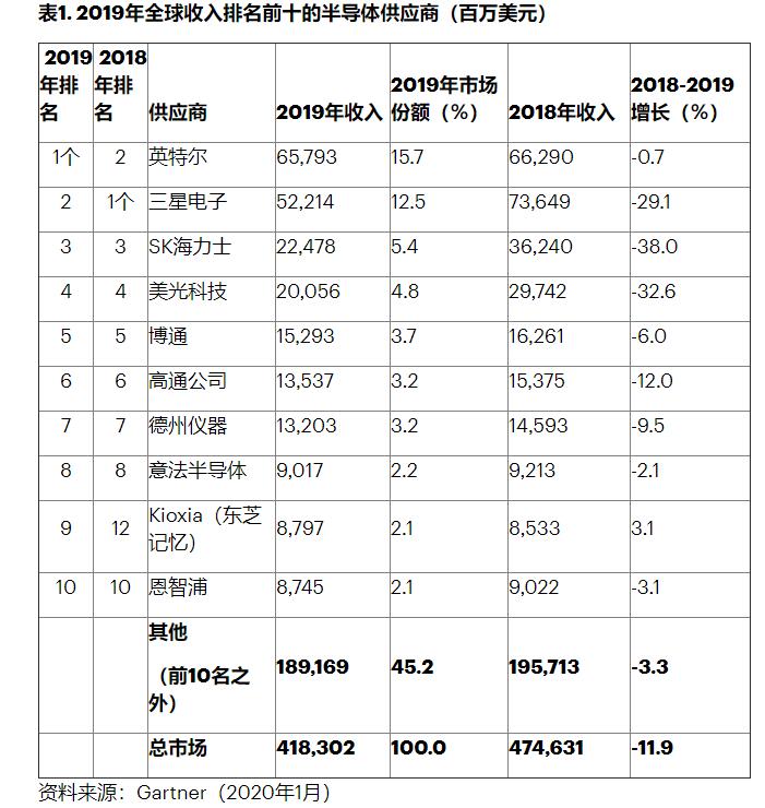 根據(jù)調(diào)研機(jī)構(gòu)Gartner的數(shù)據(jù),2019年全球半導(dǎo)體收入總計(jì)4183億美元,同比下降11.9%。其中,英特爾受益于服務(wù)器CPU復(fù)蘇,重新奪回市場(chǎng)第一的位置,而在2017-2018年連續(xù)排在榜首的三星電子由于存儲(chǔ)產(chǎn)品行情惡化退居第二。