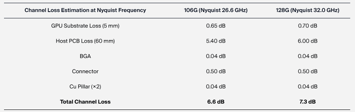 表1. 在106 Gbps和128 Gbps速率下,從XPU到NPO的電通道損耗分解估算。總通道損耗已用粗體標(biāo)出。