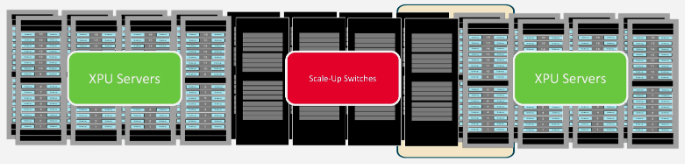 圖8展示了縱向擴(kuò)展交換機(jī)與加速器服務(wù)器解耦部署的示例??v向擴(kuò)展交換機(jī)可集中部署于專用的交換機(jī)機(jī)柜中,從而在功耗與效率方面實(shí)現(xiàn)優(yōu)化。同樣,加速器服務(wù)器機(jī)柜也可針對液冷、供電等系統(tǒng)進(jìn)行專門優(yōu)化。借助支持高達(dá)50米傳輸距離的光互連,以及單跳內(nèi)8至10個(gè)服務(wù)器機(jī)柜的全連接能力,單跳網(wǎng)絡(luò)內(nèi)可連接的加速器數(shù)量將僅受限于交換機(jī)的端口密度。