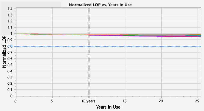 圖7. 200 Gbps VCSEL在60°C、9 mA偏置操作條件下的輸出功率變化。藍(lán)線代表輸出功率下降20%的失效判據(jù)。
