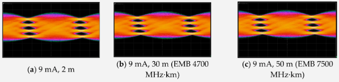 圖6. 200 Gbps PAM4 VCSEL的眼圖。(a)2米OM4光纖末端,(b)30米OM4光纖末端(EMB 4700 MHz·km),(c)50米康寧定制光纖末端(EMB 7500 MHz·km)。