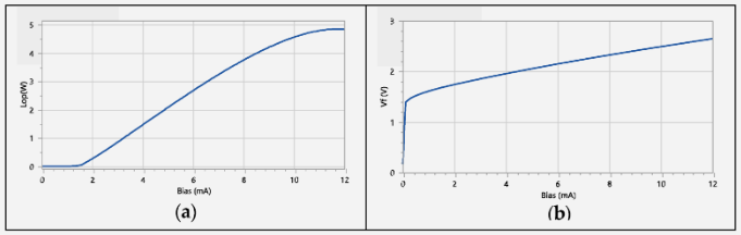 圖3. 200 Gbps PAM4 VCSEL的(a)光功率-電流與(b)電壓-電流特性。