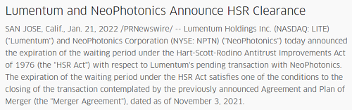 ICC訊(編譯:Nina)上周五(2022年1月21日),Lumentum公司(納斯達(dá)克:LITE)和NeoPhotonics公司(紐交所:NPTN)宣布,Lumentum收購NeoPhotonics的《1976年哈特-斯科特-羅迪諾反壟斷改進(jìn)法案》(HSR法案)等待期到期。HSR法案規(guī)定的等待期屆滿滿足了先前宣布的合并協(xié)議所設(shè)想的交易完成的條件之一。
