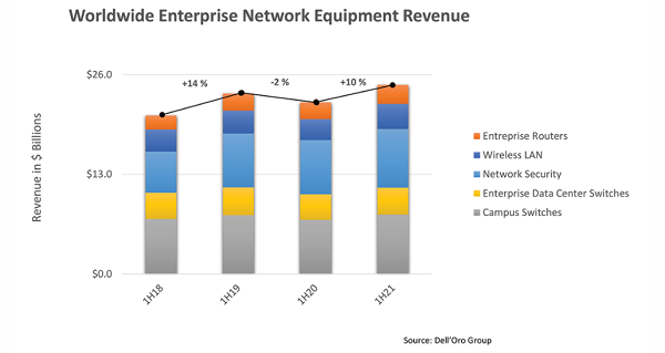 2021年上半年,全球企業(yè)網(wǎng)絡(luò)設(shè)備市場(chǎng)同比增長(zhǎng)10%(其中第一季度同比增長(zhǎng)10%,第二季度同比增長(zhǎng)11%),收入超過2019年大流行前的水平。