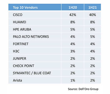 分析表明,前十名供應(yīng)商的排名和份額保持相對(duì)穩(wěn)定,前兩名供應(yīng)商思科華為占全球企業(yè)網(wǎng)絡(luò)設(shè)備市場(chǎng)的近50%份額。然而,相比2020年上半年,思科失去了一些份額,同時(shí)Palo Alto Networks、H3C和Arista的市場(chǎng)份額分別上升了1個(gè)百分點(diǎn)。