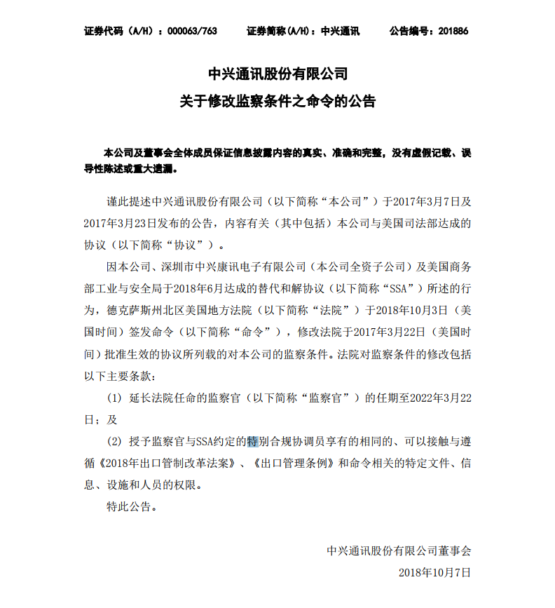 ICCSZ訊 (編輯:Nicole)中興通訊近日公告稱:因本公司、深圳市中興康訊電子有限公司(本公司全資子公司)及美國商務(wù)部工業(yè)與安全局于2018年6月達成的替代和解協(xié)議(以下簡稱“SSA”)所述的行為,德克薩斯州北區(qū)美國地方法院于2018年10月3日(美國時間)簽發(fā)命令(以下簡稱“命令”),修改法院于2017年3月22日(美國時間)批準(zhǔn)生效的協(xié)議所列載的對本公司的監(jiān)察條件。