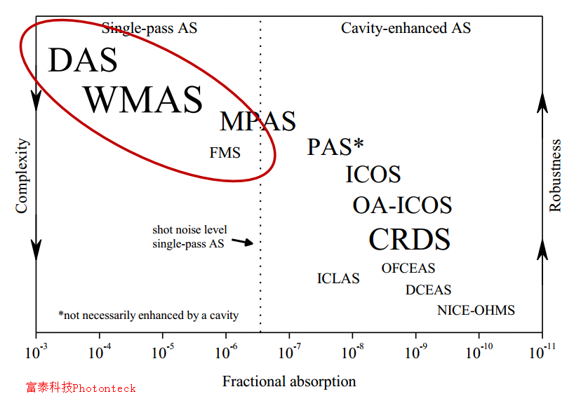 高精度和高靈敏度激光光譜技術(shù)主要有:紫外差分吸收光譜(DOAS),可調(diào)諧二極管激光吸收光譜(TDLAS、它包含直接吸收DAS和波長調(diào)制WMAS和頻率調(diào)制FMS)、光聲光譜(PAS)、增強吸收光譜技術(shù){它主要是通過測量內(nèi)腔吸收或者腔內(nèi)光場的衰減時間來實現(xiàn)的,內(nèi)腔吸收稱為腔增強吸收光譜(電CEAS 和光反饋腔增強吸收光譜(OF-CEAS) 腔內(nèi)光場稱為腔衰蕩光譜(CRDS)}、積分腔輸出光譜技術(shù)(ICOS)、離軸積分腔輸出光譜(OA-ICOS)、、噪聲免疫腔增強光外差分子光譜(NICE-OHMS)。