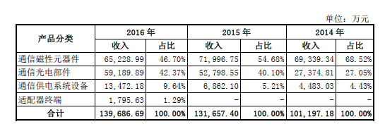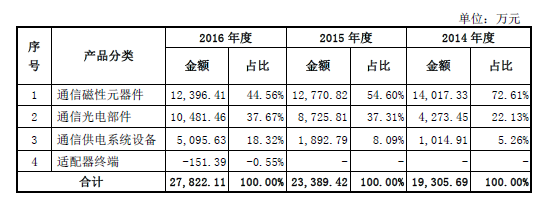 報(bào)告期內(nèi),東莞銘普光磁公司產(chǎn)品主要以通信磁性元器件和通信光電部件為主。2014 年、2015 年和2016 年公司該兩類(lèi)產(chǎn)品合計(jì)銷(xiāo)售收入占公司主營(yíng)業(yè)務(wù)收入總額比例分別為95.57%、94.78%和89.07%。隨著公司于2012 年涉足通信供電系統(tǒng)設(shè)備領(lǐng)域并通過(guò)近年來(lái)的業(yè)務(wù)推廣,公司報(bào)告期內(nèi)通信供電系統(tǒng)設(shè)備銷(xiāo)售額快速增長(zhǎng)。2016 年,公司綜合市場(chǎng)需求等因素考慮,逐步投入生產(chǎn)并銷(xiāo)售適配器終端產(chǎn)品,但目前銷(xiāo)售額及收入占比仍處于較低水平。