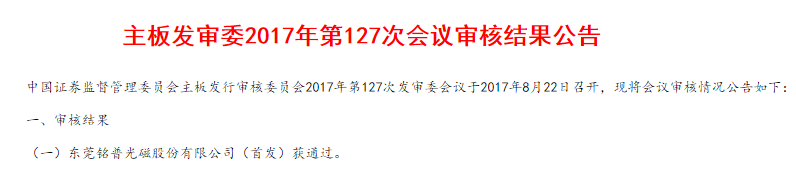 ICCSZ訊 最新消息,證監(jiān)會(huì)22日晚間公布了《主板發(fā)審委2017年第127次會(huì)議審核結(jié)果》,東莞銘普光磁股份有限公司(以下簡(jiǎn)稱(chēng)“東莞銘普光磁”)首發(fā)申請(qǐng)獲通過(guò)。據(jù)了解,東莞銘普光磁此次IPO的保薦機(jī)構(gòu)為中信建投。按之前披露的招股書(shū)顯示,東莞銘普光磁此次擬于深交所A股公開(kāi)發(fā)行不超過(guò)3500萬(wàn)股,計(jì)劃募集資金4.35億元,擬用于通信磁性元器件產(chǎn)品生產(chǎn)、通信光電部件產(chǎn)品生產(chǎn)等項(xiàng)目。