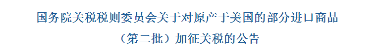 加征關(guān)稅清單點(diǎn)擊:國(guó)務(wù)院關(guān)稅稅則委員會(huì)關(guān)于對(duì)原產(chǎn)于美國(guó)的部分進(jìn)口商品(第二批)加征關(guān)稅的公告