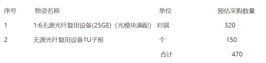 1:6無源光纖復(fù)用設(shè)備(25GE)(光模塊滿配)320對端,無源光纖復(fù)用設(shè)備1U子框150個。