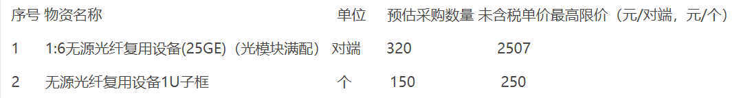 1:6無源光纖復(fù)用設(shè)備(25GE)(光模塊滿配)2507元/對端,無源光纖復(fù)用設(shè)備1U子框250元/個。