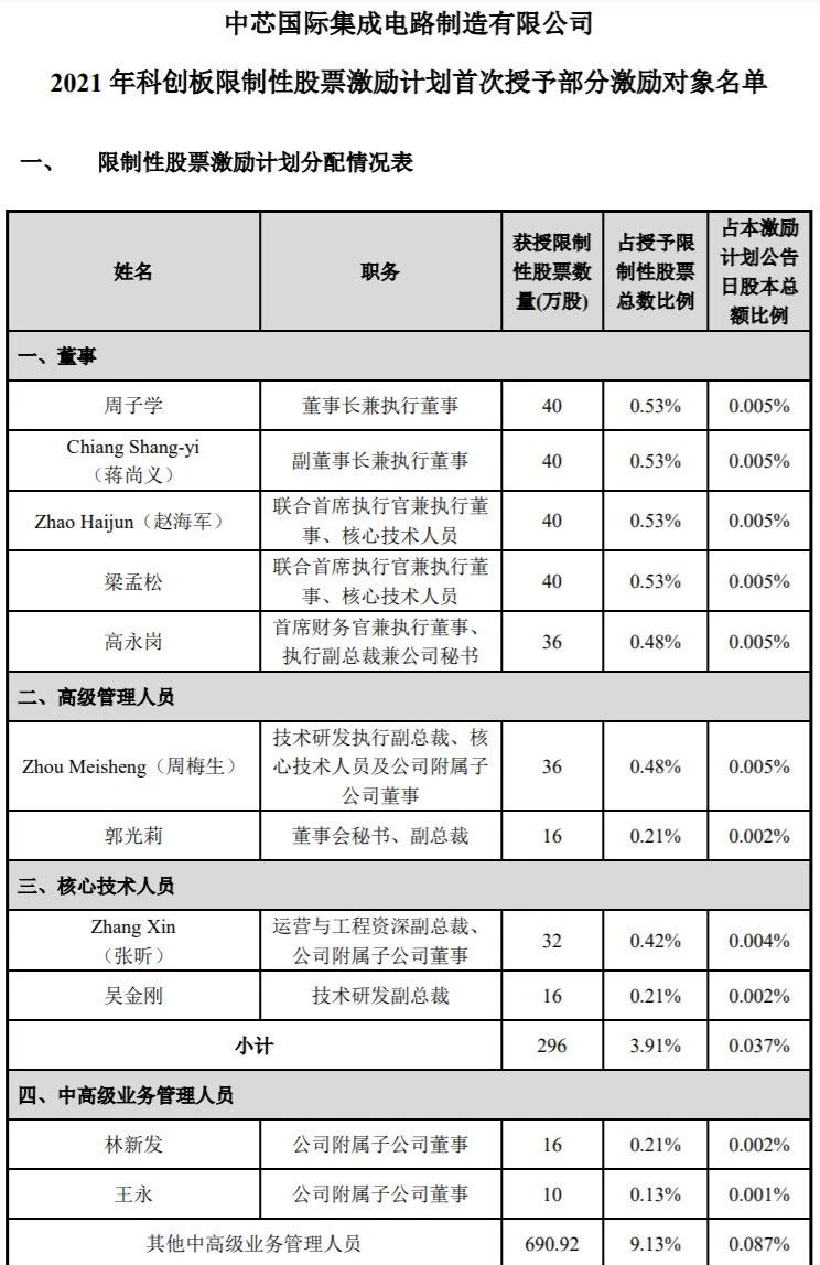 ICC訊 5月19日晚,中芯國際發(fā)布公告,稱公司董事會審議通過《2021年科創(chuàng)板限制性股票激勵計劃(草案)》及其相關議案。