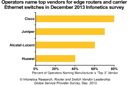 Infonetics聯(lián)合創(chuàng)始人兼首席運(yùn)營商分析師Michael Howard稱:“全球前四位邊緣路由器和運(yùn)營商級(jí)以太網(wǎng)交換機(jī)市場(chǎng)份額供應(yīng)商是:思科、瞻博網(wǎng)絡(luò)、阿爾卡特朗訊和華為。”