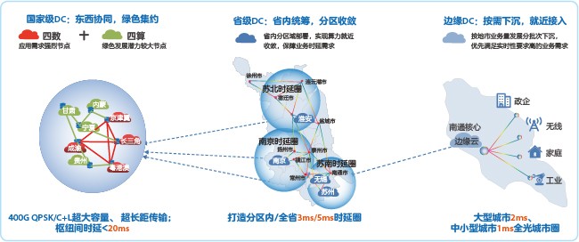 對(duì)光網(wǎng)絡(luò)的另一個(gè)迫切需求是極致的時(shí)延體驗(yàn)。以DC為中心,構(gòu)建分級(jí)超低時(shí)延圈,能夠打通全光入云運(yùn)力大動(dòng)脈,滿足千行百業(yè)對(duì)極致時(shí)延的迫切需求。