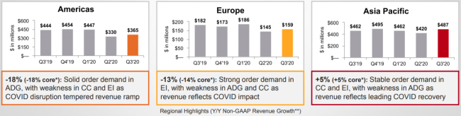 GAAP銷售收入10.11億美元,去年同期10.87億美元?;诤诵幕A的非GAAP銷售收入下滑了7%,其中不包括匯率變化影響以及與過去12個月內收購或出售的業(yè)務相關的收入。
