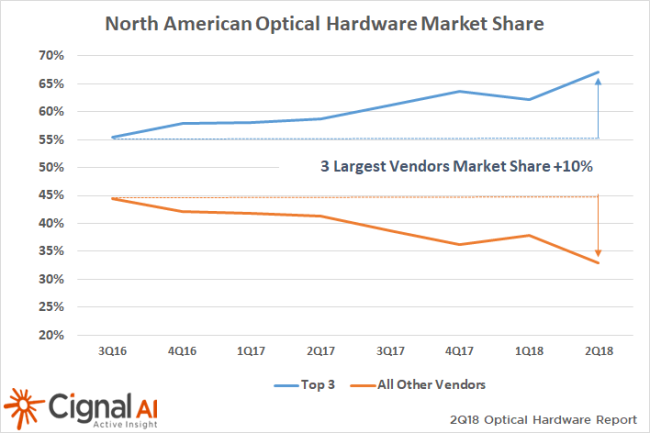 Cignal AI的首席分析師Andrew Schmitt表示:“北美地區(qū)的光網(wǎng)絡硬件支出在第二季度再次下降,但大型設備供應商的表現(xiàn)在持續(xù)走好。在過去兩年中,該地區(qū)前三大光網(wǎng)絡設備商以較小的競爭對手為代價鞏固了10%的市場份額。在北美市場,小型光網(wǎng)絡設備商的處境已經(jīng)變得更加艱難?!?