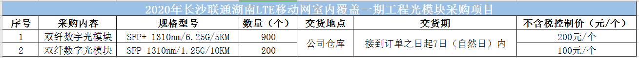 根據(jù)此前招標(biāo)公告顯示,該項目規(guī)模為20萬元(不含稅),不劃分標(biāo)段,選取一名中標(biāo)人。設(shè)置招標(biāo)控制價:雙纖數(shù)字光模塊SFP+1310nm/6.25G/5KM不含稅價200元/個,雙纖數(shù)字光模塊SFP 1310nm/1.25G/10KM不含稅價100元/個,超過招標(biāo)控制價的報價投標(biāo)將被否決。