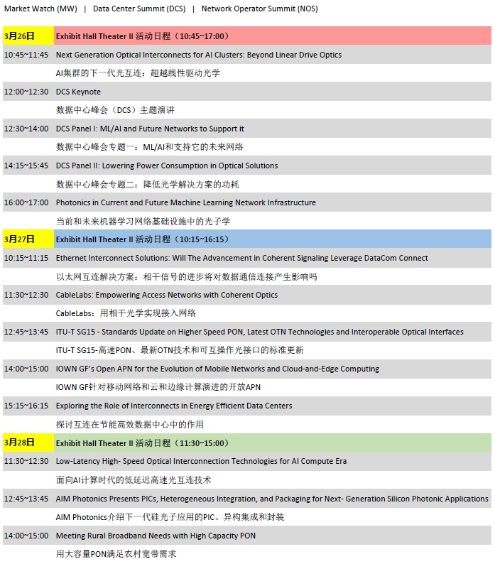 除了為期五天(3.24-3.28)的技術(shù)會(huì)議,OFC還將在展場(chǎng)舉辦一系列免費(fèi)會(huì)議活動(dòng),包括市場(chǎng)觀察/Market Watch(MW)、網(wǎng)絡(luò)運(yùn)營(yíng)商峰會(huì)/Network Operator Summit(NOS)、數(shù)據(jù)中心峰會(huì)/Data Center Summit(DCS)三場(chǎng)主要會(huì)議以及超過(guò)15個(gè)其他展場(chǎng)項(xiàng)目,涵蓋全球品牌和行業(yè)領(lǐng)導(dǎo)者的市場(chǎng)趨勢(shì)和新技術(shù)。