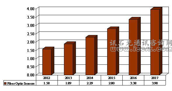 從上圖可以看出光纖傳感市場(chǎng)每年都在不斷增長(zhǎng),并且在預(yù)測(cè)期2013至2017年的年復(fù)合增長(zhǎng)率為20%。