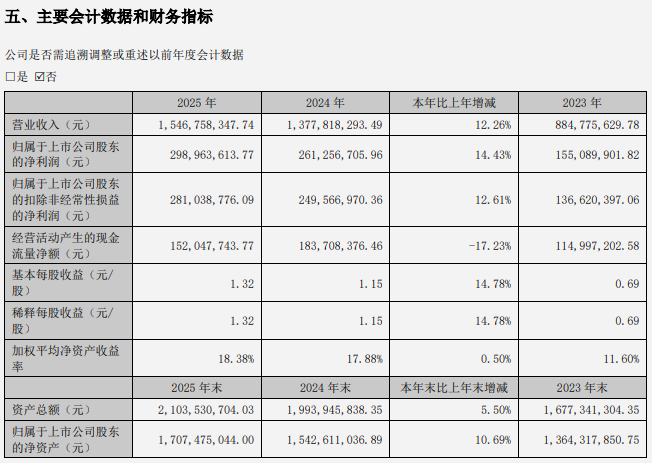 2025年,公司實(shí)現(xiàn)歸屬于上市公司股東的凈利潤(rùn)2.99億元,同比增長(zhǎng)14.43%。基本每股收益為1.32元,同比增長(zhǎng)14.78%。加權(quán)平均凈資產(chǎn)收益率為18.38%,較上年提升0.50個(gè)百分點(diǎn)。