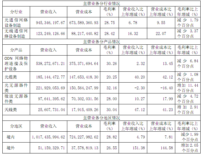 報告期內(nèi),分業(yè)務看,光通信網(wǎng)絡設備業(yè)務營收9.45億元,同比增長6.78%,毛利率為28.75%;無線通信網(wǎng)絡設備營收1.23億元,同比增長16.32%,毛利率為28.42%。