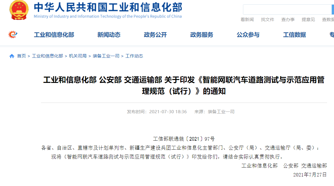 ICC訊 據(jù)工業(yè)和信息化部網(wǎng)站,工業(yè)和信息化部、公安部、交通運輸部 7 月 27 日印發(fā)了《智能網(wǎng)聯(lián)汽車道路測試與示范應用管理規(guī)范(試行)》的通知。
