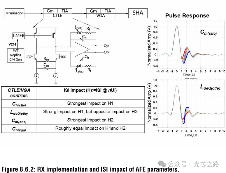 下圖中的表格根據其在不同 ISI 位置的影響對各種 CTLE 頻率控制進行分類。例如,電感峰值控制(LdeQ(ctle))對 1UI 的 ISI 有很強的影響,但在 2UI 的 ISI 上則有相反的效果。源衰減峰值控制(Cm(ctle))通常對 H2 有最強的影響,而對 H1 沒有影響。通過使用這些控制組合,第二級ISI 得以消除,同時對其他位置的碼間干擾影響極小。